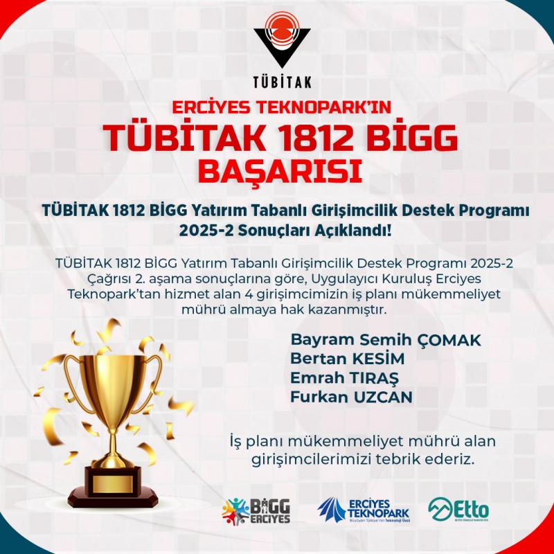 TÜBİTAK 1812 BİGG Yatırım Tabanlı Girişimcilik Destek Programı 2025-2 Çağrısı 2. aşama sonuçlarına göre, Uygulayıcı Kuruluş Erciyes Teknopark’tan hizmet alan 4 girişimcimizin iş planı mükemmeliyet mührü almaya hak kazanmıştır.