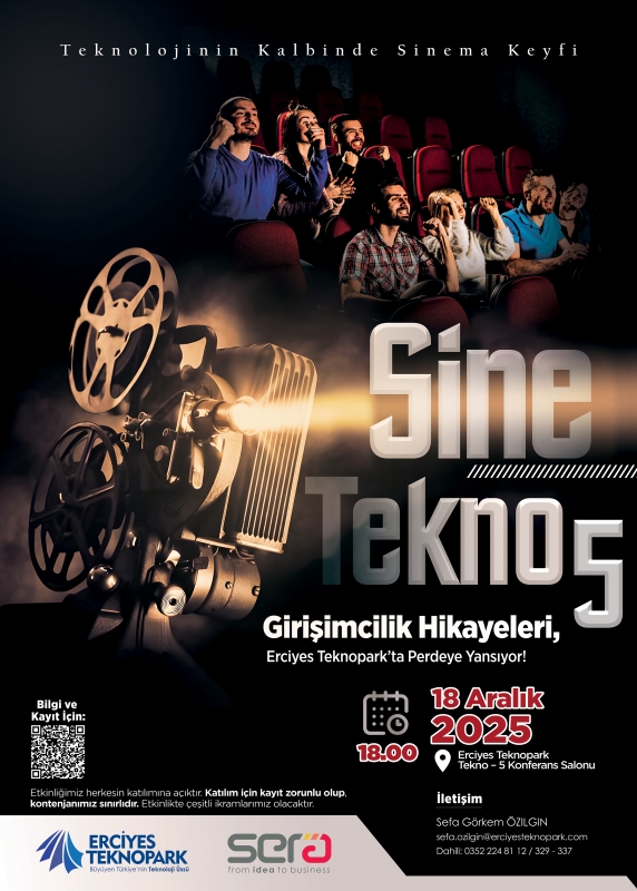 Erciyes Teknopark olarak, girişimcilik ekosistemine ilham vermeye, kaldığımız yerden devam ediyoruz! Büyük ilgi gören SineTekno etkinliğimizin beşincisiyle yeniden karşınızdayız. Teknoloji, yenilikçilik ve girişimcilik ruhunu beyaz perdeye taşıyan ilham verici filmlerle dolu bir akşam sizleri bekliyor. Etkinliğimiz herkesin katılımına açıktır. Girişimcilik yolculuğunuzda size ışık tutacak bu etkinliği kaçırmayın!